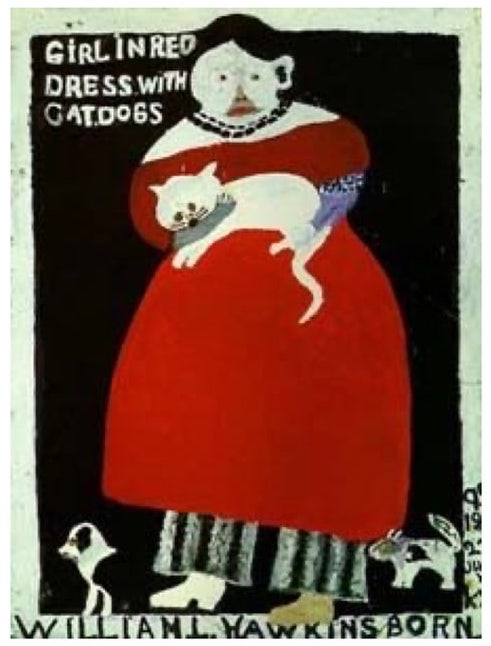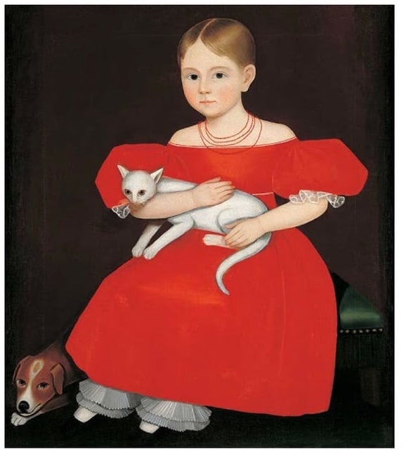 Santanimus: Yes! My mom has a cover of this Ammi Phillips painting titled Girl in Red Dress with Cat and Dog (1830-1835). I grew up thinking that it was an original until I saw it at the American Folk Art Museum when I was 20 during my first trip to New York. William Hawkins made an incredible cover of this work. When I saw it 2 years ago, I screamed and knew exactly what the reference image was. Lady in Red is a cover of this work meditating on Hawkins’ version and my mother’s cover. Except my cover features Santa as a bearded lady serving some Virgin Mary and Baby Jesus/Isis and Hathor enthroned animal-kin vibes. I’m into Donna Haraway’s mantra in Staying with the Trouble, “Make kin not babies!”